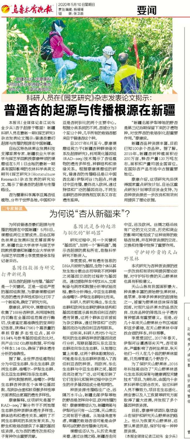 自治区特色林果业发展科技支撑首席专家、99久久婷婷国产一区二区林学与园艺学院教授廖康带领的课题组,在5月1日出版的最新一期农林科学类具有国际影响的英文期刊《园艺研究》(Horticulture Research)杂志发表的研究论文,揭示了普通杏的起源与传播路径。
