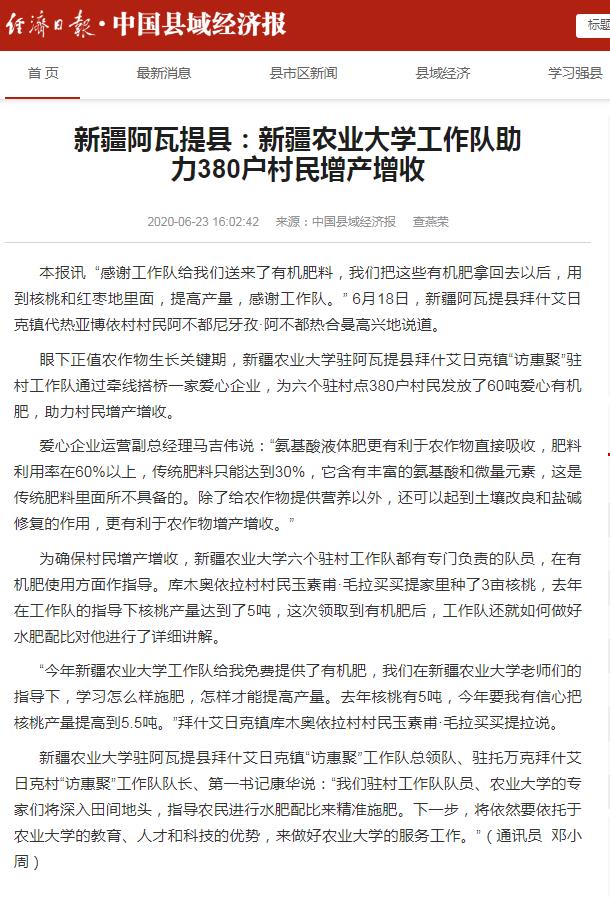 本报讯 “感谢工作队给我们送来了有机肥料,我们把这些有机肥拿回去以后,用到核桃和红枣地里面,提高产量,感谢工作队。”6月18日,新疆阿瓦提县拜什艾日克镇代热亚博依村村民阿不都尼牙孜·阿不都热合曼高兴地说道。