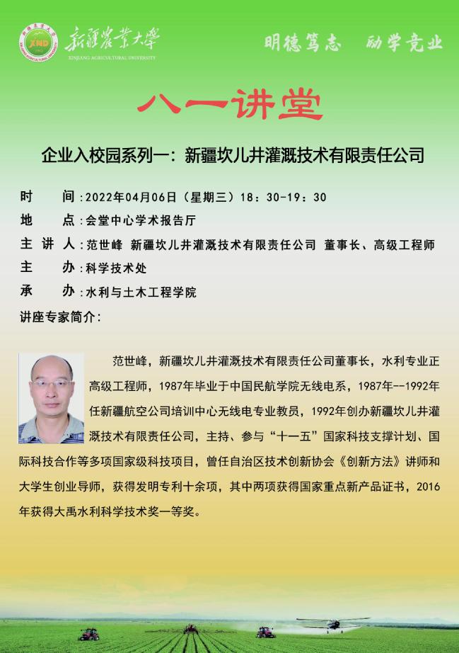 【学术预告】八一讲堂第十一期之企业入校园系列一:新疆坎儿井灌溉技术有限责任公司