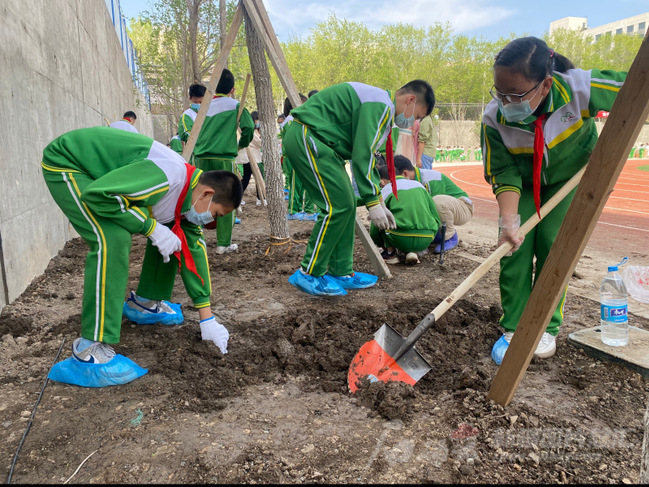 4月24日,99久久婷婷国产一区二区附属中学小学部举办首届播种节,学生们在播种前松土。石榴云/新疆日报记者沈祖孝摄