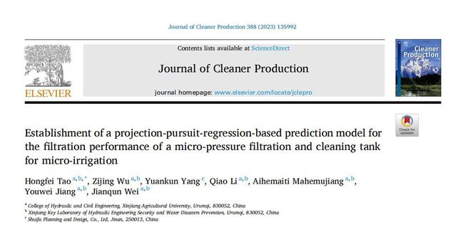 2023年1月11日,陶洪飞副教授团队在TOP期刊Journal of Cleaner Production上发表题为“Establishment of a projection-pursuit-regression-based prediction model for the filtration performance of a micro-pressure filtration and cleaning tank for micro-irrigation”的研究论文,该研究从泥沙去除率、截沙质量及过滤时间三个方面考察了微压过滤冲洗池处理含沙水的过滤情况,探明了微压过滤冲洗池的过滤性能,为其推广应用提供了理论基础。
