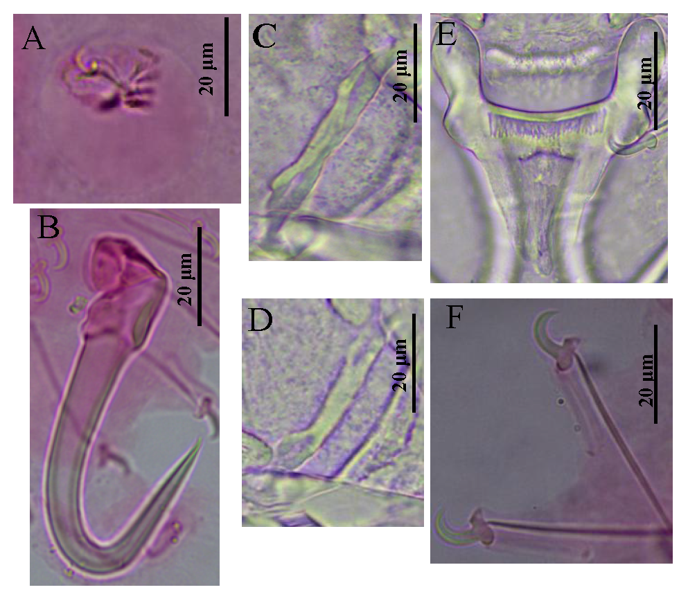 通过对裸重唇三代虫与已知三代虫的形态学特征比较发现,该虫与其他三代虫成员之间具有可识别的形态学差异。裸重唇三代虫具有钩基部弯曲且背联接片中空的独特特征,与寄生在裂腹鱼鱼类上的其他11种三代虫具有明显的差异(图2)。