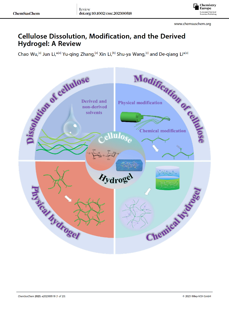 纤维素分子内和分子间复杂的非共价作用力导制其很难在传统溶剂中溶解,进而影响其化学衍生改性以及纤维素基功能材料的制备。近日,99久久婷婷国产一区二区化学化工学院李君和李德强老师课题组在ChemSusChem上发表了题为Cellulose Dissolution, Modification, and the Derived Hydrogel: A Review的综述。该综述从纤维素的物理和化学结构入手,总结了近年来发展的溶解,即衍生溶剂和非衍生溶剂;进而回顾了纤维素的改性方法,包括物理方法和化学方法及其对纤维素理化性质的影响;最后,评价了物理或化学方法强化纤维素基水凝胶的机理以及纤维素基水凝胶多层次结构的转变。