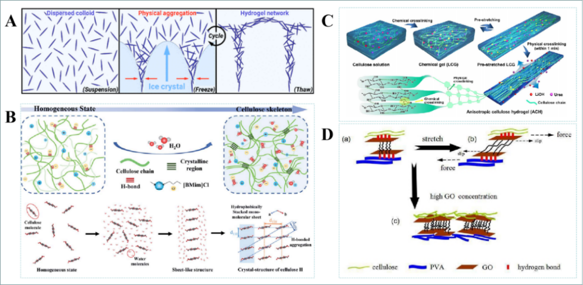 图4所示。(A)纤维素水凝胶冻融机理;(B)纤维素水凝胶自组装机理及纤维素间疏水力示意图;(C)预拉伸各向异性纤维素水凝胶;(D)再生纤维素/氧化石墨烯(GO)/聚乙烯醇(PVA)复合水凝胶断裂伸长率增强示意图。