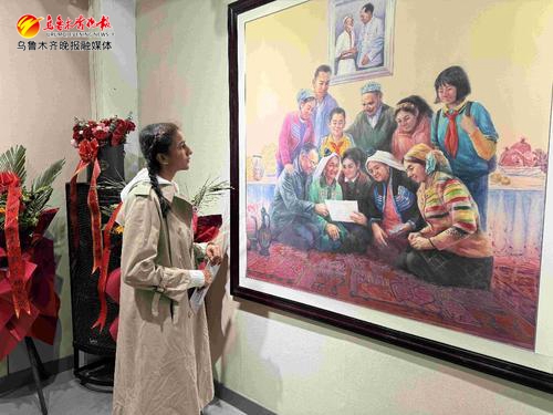 同样学美术专业的埃曼则在画家马宏彦的系列作品《帕米尔雄鹰》前细细欣赏,听马宏彦解读作品故事——英雄楷模拉齐尼·巴依卡是一位护边员,为救落水儿童英勇牺牲。她眼中含泪,“在每一幅作品里我都看到了故事,感受人类崇高的情感。”
