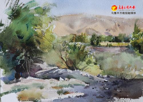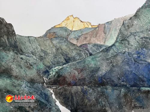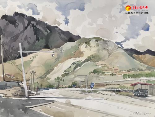马宏彦水彩作品《天山之路》。记者赵剑尘摄