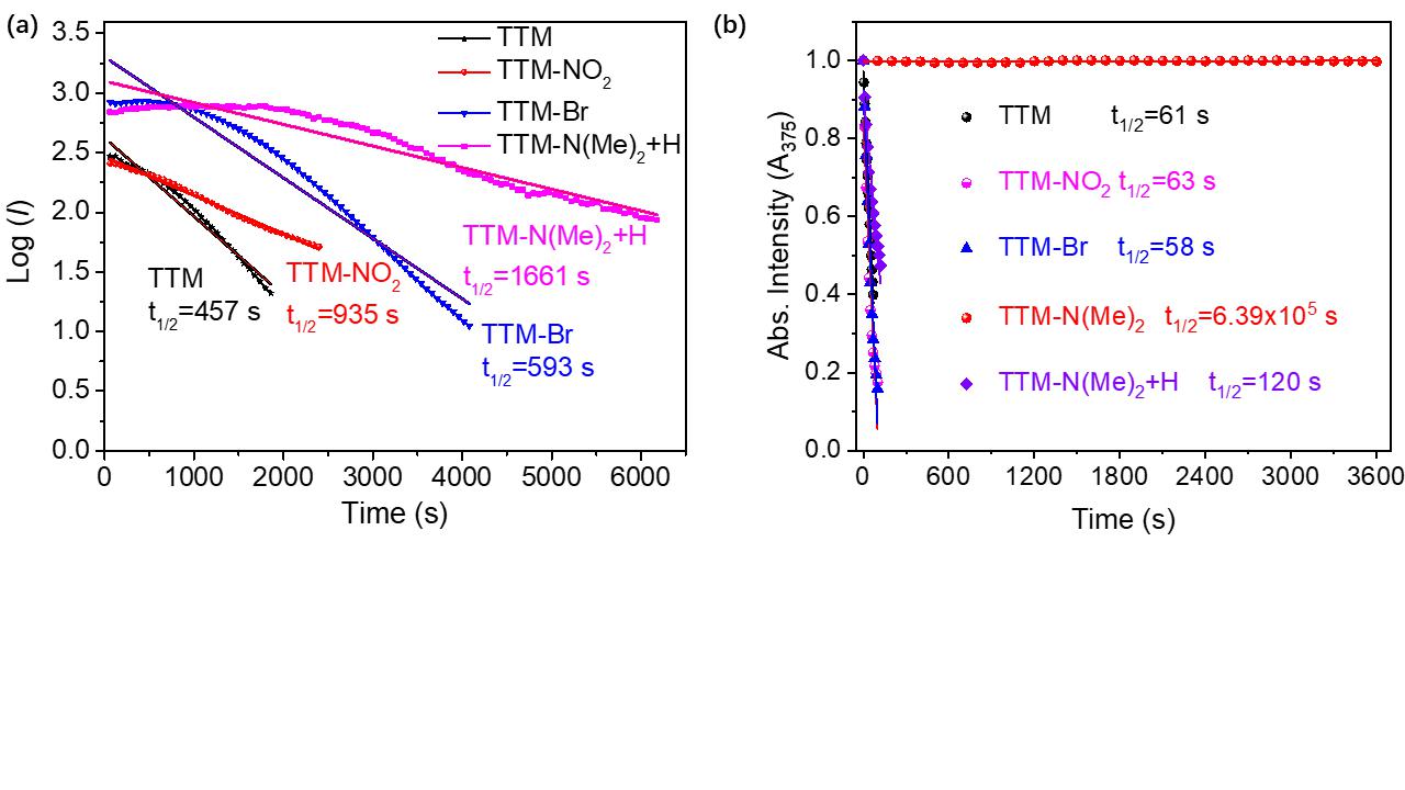 图3 (a) 365 nm 激发波长下,自由基TTM, TTM-NO2, TTM-Br和TTM-N(Me)2+H荧光强度的对数值随时间的变化曲线;(b) 自由基TM, TTM-NO2, TTM-Br、TTM-N(Me)2和TTM-N(Me)2+H用365 nm 紫外等照射后的吸光度(在375 nm 处)随时间的变化曲线