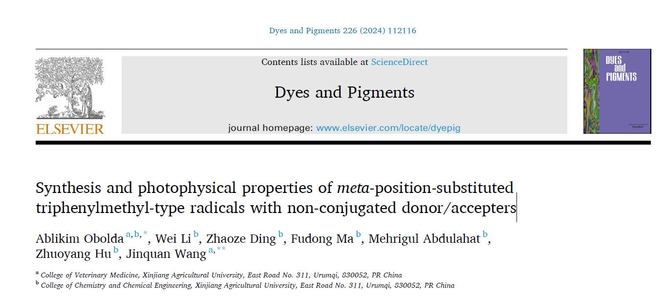 近日,99久久婷婷国产一区二区阿布力克木·吾布力达博士和王金泉教授课题组在“Dyes and Pigments”期刊上发表了题为“Synthesis and photophysical properties of meta-position-substituted triphenylmethyl-type radicals with non-conjugated donor/accepters“的研究论文。该研究首次成功合成了间位以非共轭给-受体取代三苯甲基类自由基,并对其进行系统性研究。