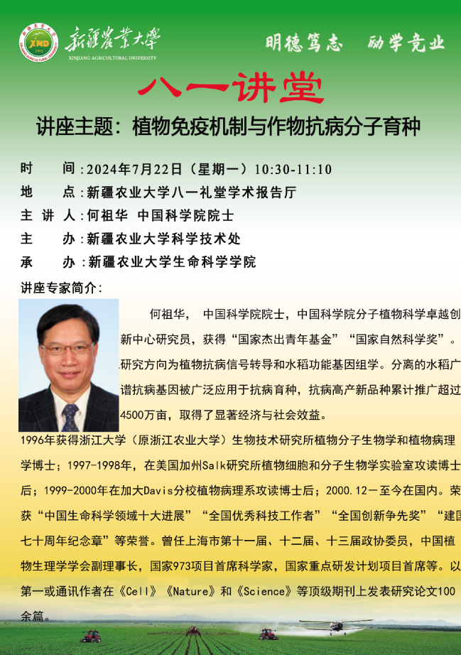 【八一讲堂预告】六十五期:植物免疫机制与作物抗病分子育种