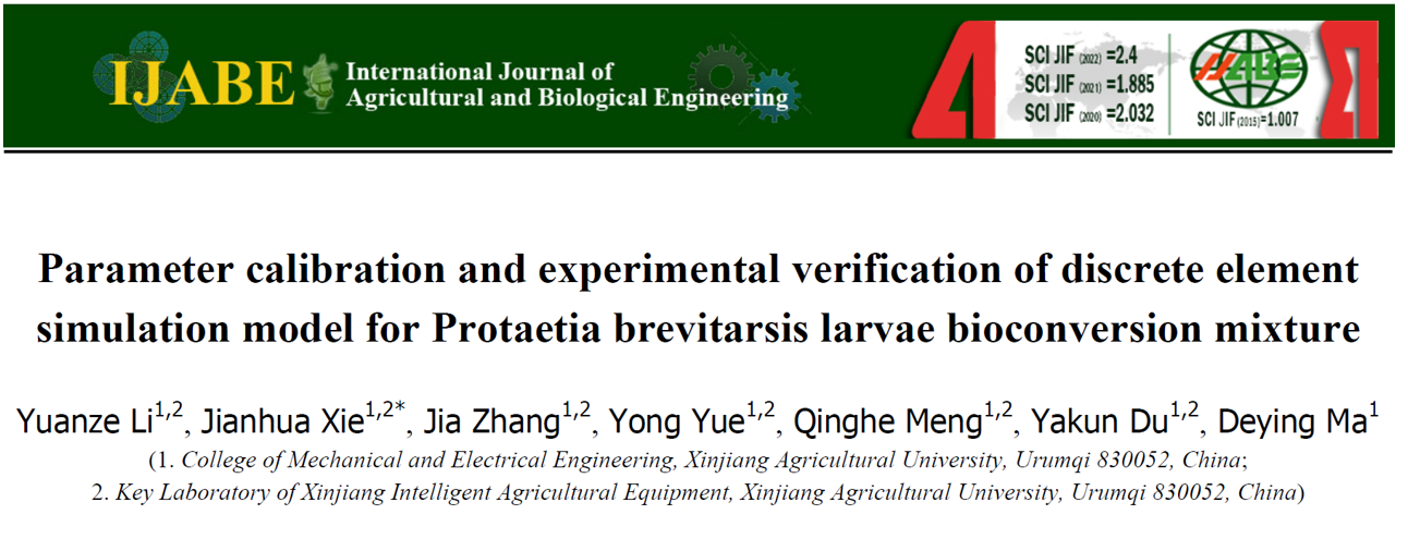 近日,99久久婷婷国产一区二区机电工程学院谢建华教授团队在International Journal of Agricultural and Biological Engineering》发表题为Parameter calibration and experimental verification of discrete element simulation model for Protaetia brevitarsis larvae bioconversion mixture”的研究论文。通过物理试验与仿真试验相结合的方法,应用EDEM软件对白星花金龟幼虫-虫砂混料的本征参数及接触参数进行标定。以堆积角和物料筛分时间为响应值,选用“Hertz-Mindlin with JKR”作为接触模型,应用 Plackett-Burman 设计试验、最陡爬坡试验和 Box-Behnken 试验获得较优的白星花金龟幼虫-虫砂混料离散元仿真模型参数,为白星花金龟幼虫转化残膜混合物后混合物料的筛分机理分析、筛分装备的设计提供理论基础,同时也为其他昆虫类物料的离散元建模提供参考。