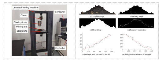 通过万能试验机对白星花金龟幼虫-虫砂混料进行圆筒提升试验,获得白星花金龟幼虫-虫砂混料的实际堆积角,利用高清相机拍摄混料的前视图像,视图像导入Matlab软件进行灰度处理、二值化处理、孔洞填充、提取边界轮廓操作后,将轮廓图导入Origin软件获取轮廓各点坐标值,再将轮廓坐标值转化为点线图并进行线性拟合,获得堆积角实际数值27.67。