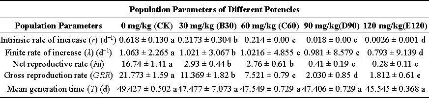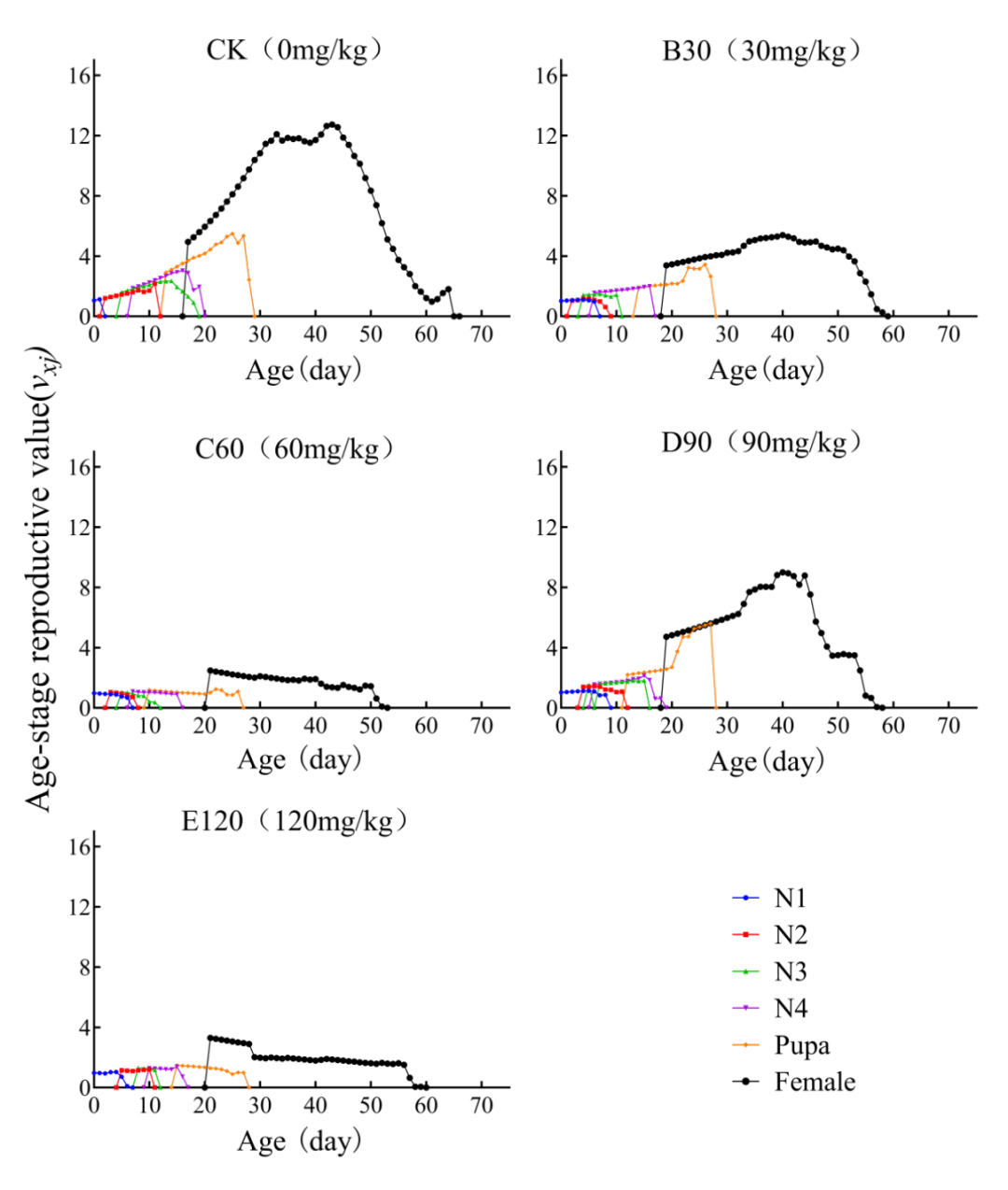 马铃薯植株受重金属镉胁迫下马铃薯甲虫的特定年龄-阶段繁殖值(vxj)
