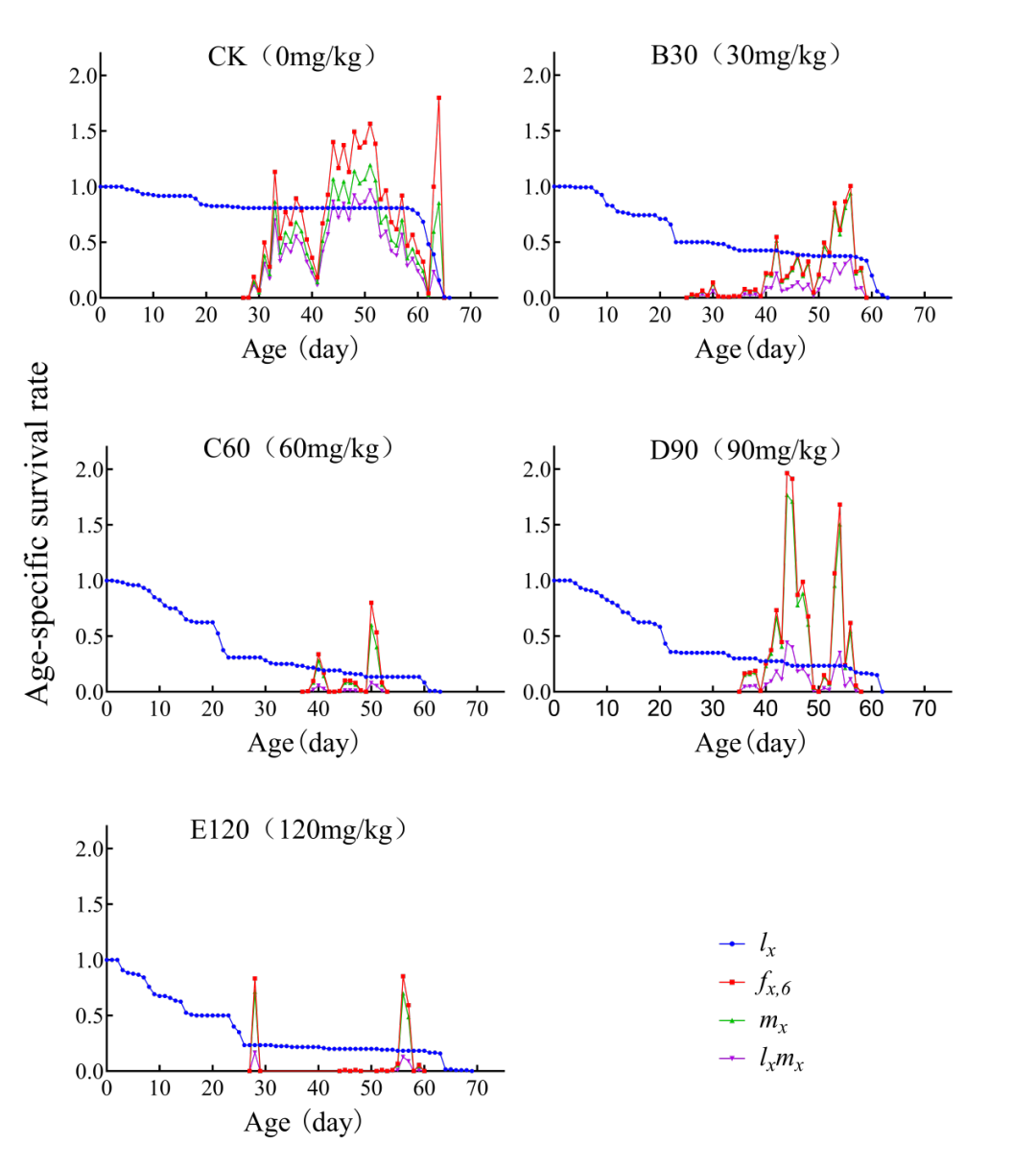 马铃薯植株受重金属胁迫下马铃薯甲虫的特定年龄存活率(lx)、雌虫特定年龄繁殖力(fx,6)、