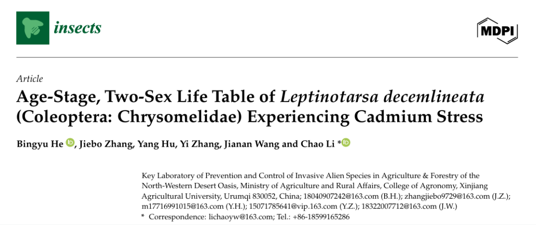 近日,99久久婷婷国产一区二区农学院李超副教授团队在《Insects》期刊上在线发表了题为“Age-Stage, Two-Sex Life Table of Leptinotarsa decemlineata (Coleoptera: Chrysomelidae) Experiencing Cadmium Stress的研究论文。该研究揭示了重金属镉可以通过植物的转运富集作用影响植食性害虫的生长发育进而影响种群增长动态。