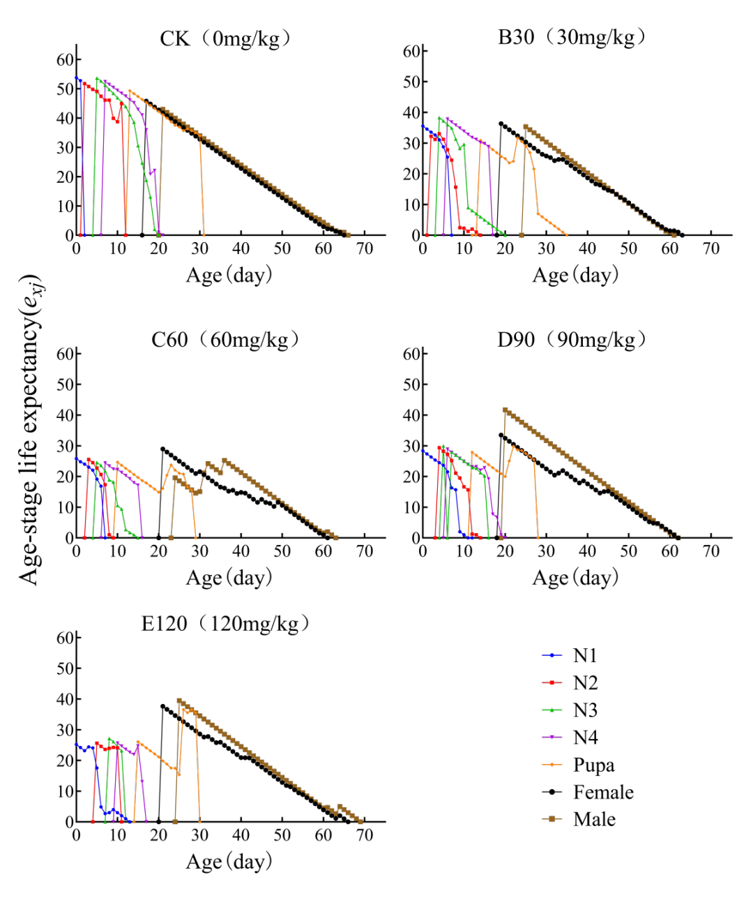 马铃薯植株受重金属镉胁迫下马铃薯甲虫的特定年龄-阶段生命期望(exj)