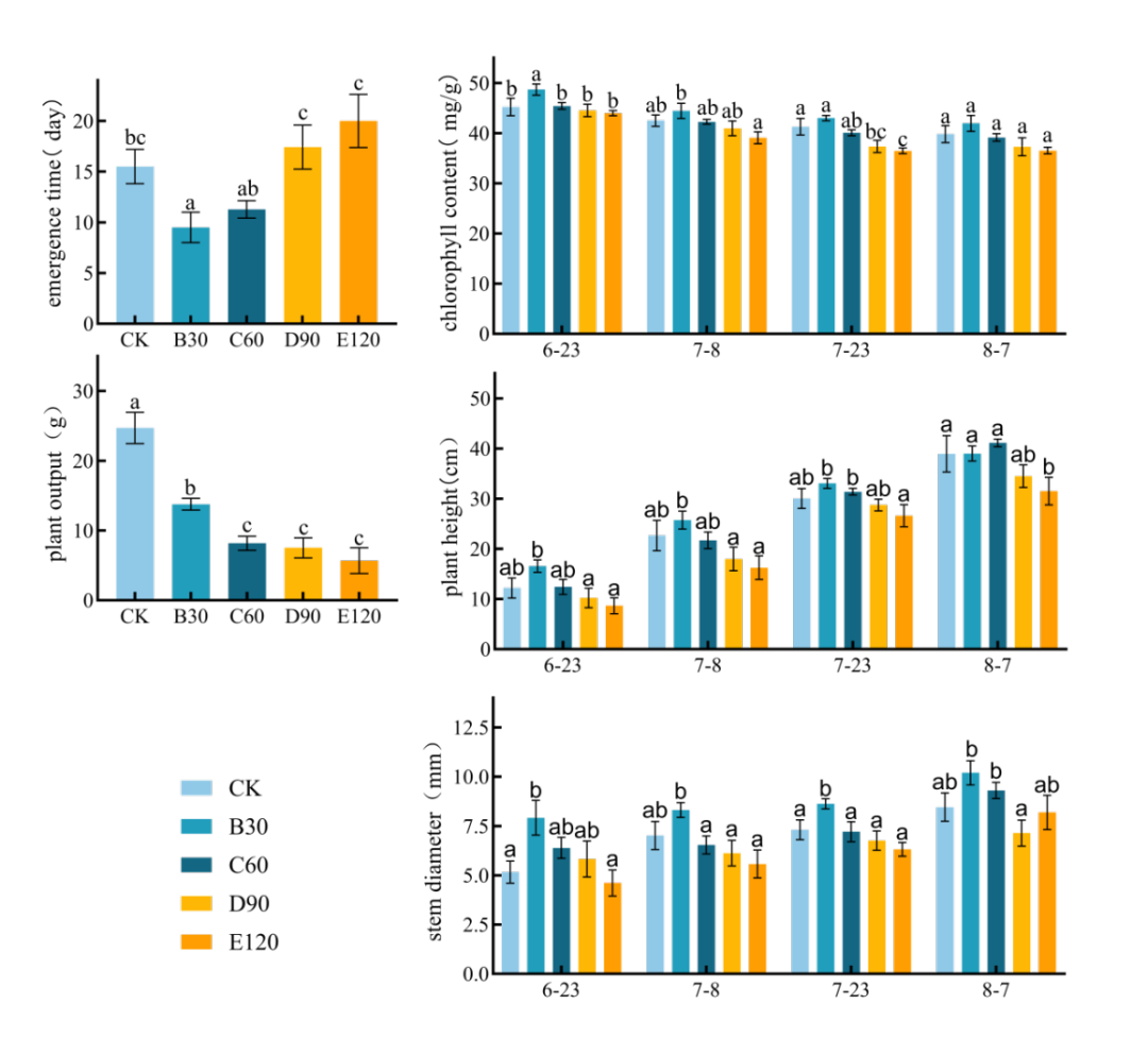 S1 不同浓度镉处理对马铃薯出苗、生长和产量的影响。(A)马铃薯出芽时间。(B)马铃薯单株块茎产量。(C)马铃薯植株叶片叶绿素含量。(D)马铃薯植株平均高度。(E)马铃薯植株平均茎粗。