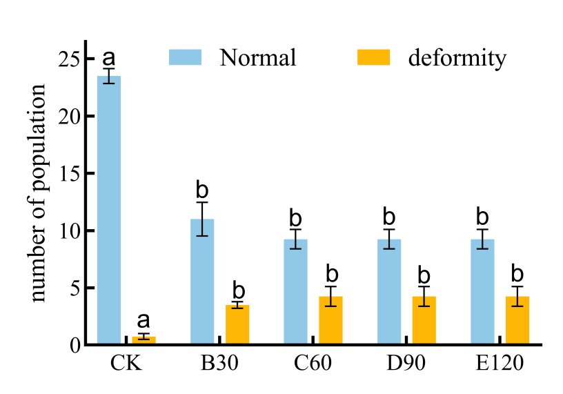 5 马铃薯植株受重金属镉胁迫下马铃薯甲虫的畸形数量。注:图中的数据为平均率±标准误差;