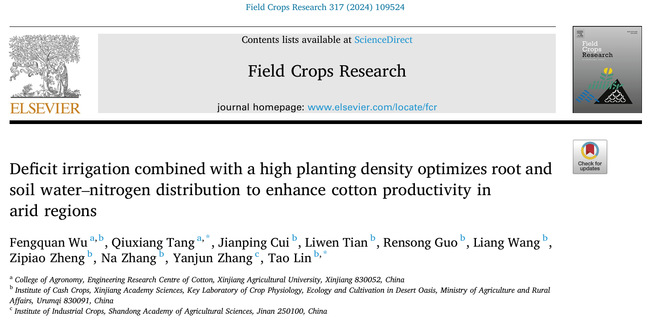 Context: Increasing the cotton planting density can reduce irrigation while maintaining the seed cotton yield. However, the underlying physiological and ecological mechanisms remain unclear. We hypothesized that increasing the planting density and reducing irrigation would promote dynamic consistency in the distribution of the roots, soil water, and nitrogen, leading to improved cotton water productivity and ultimately achieving a stable seed cotton yield.