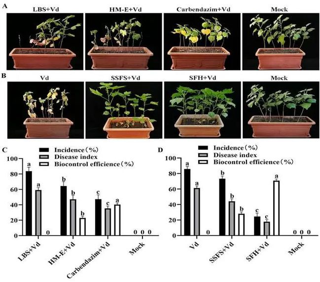 图2 C. fuscus HM-E对棉花黄萎病的室内防效(A)接种菌株HM-E发酵液对棉花黄萎病的盆栽防效;(B)接种菌株 HM-E 固体菌剂对棉花黄萎病的盆栽防效;(C)菌株HM-E发酵液灌根处理的发病率、病情指数及防效;(D)菌株HM-E固体菌剂处理的发病率、病情指数及防效。