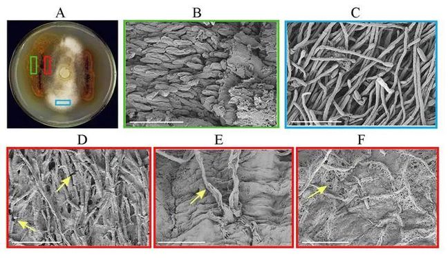 图3 C. fuscus HM-E对大丽轮枝菌的捕食作用(A)菌株HM-E对大丽轮枝菌的平板捕食作用;(B)未参与捕食的黏细菌大量聚集形成子实体;(C)正常大丽轮枝菌菌丝;菌株HM-E与大丽轮枝菌菌丝接触后,菌丝出现大量断裂(D),穿孔和畸形(E);(F)菌株HM-E分泌的大量网状代谢产物。