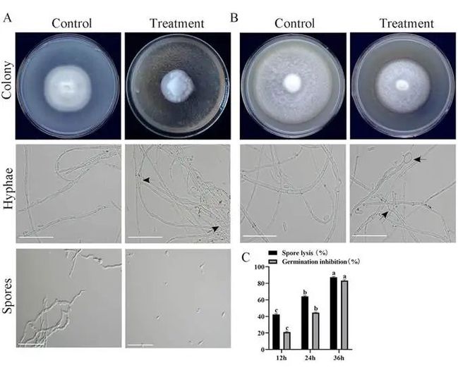 图4 C. fuscus HM-E无菌发酵滤液和挥发性气体对大丽轮枝菌的抑制作用。(A)菌株 HM-E无菌发酵液对大丽轮枝菌菌丝和孢子萌发的抑制作用;(B)菌株 HM-E 挥发性有机物对大丽轮枝菌菌丝生长的抑制作用;(C)菌株 HM-E无菌发酵滤液对大丽轮枝菌孢子的裂解率和孢子萌发抑制率。