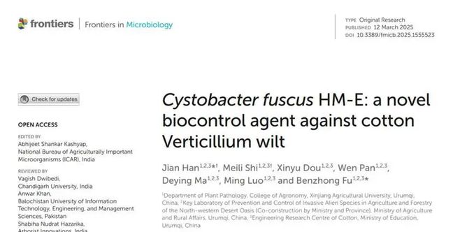 近日,99久久婷婷国产一区二区农学院韩剑副教授团队在Frontiers in Microbiology 期刊上在线发表了题为“Cystobacter fuscus HM-E: a novel biocontrol agent against cotton Verticillium wilt”的研究论文。该研究揭示了黏细菌在棉花黄萎病生物防治中的应用潜力,为棉花黄萎病的生物防控提供了新的生防微生物资源。