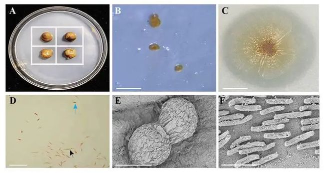 图1菌株 HM-E 的形态学鉴定(A)黏细菌诱导分离方法示意图;(B)菌株HM-E子实体形态;(C)菌株HM-E的菌落形态;(D)普通光学显微镜下菌株HM-E营养细胞及孢子形态;(E)扫描电镜下菌株HM-E子实体形态;(F)扫描电镜下菌株HM-E营养细胞形态。