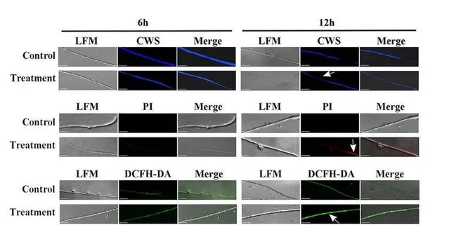图5 C. fuscus HM-E胞外粗酶液对大丽轮枝菌菌丝细胞壁、细胞膜完整性和细胞活性氧积累的影响